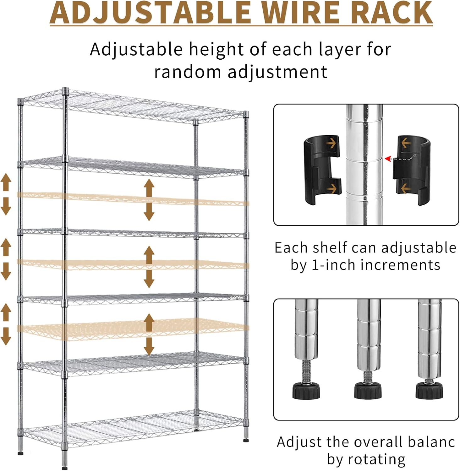 Fully Adjustable Height Design: This versatile wire shelving unit allows you to customize each shelf height at 1-inch increments to accommodate items of various sizes.