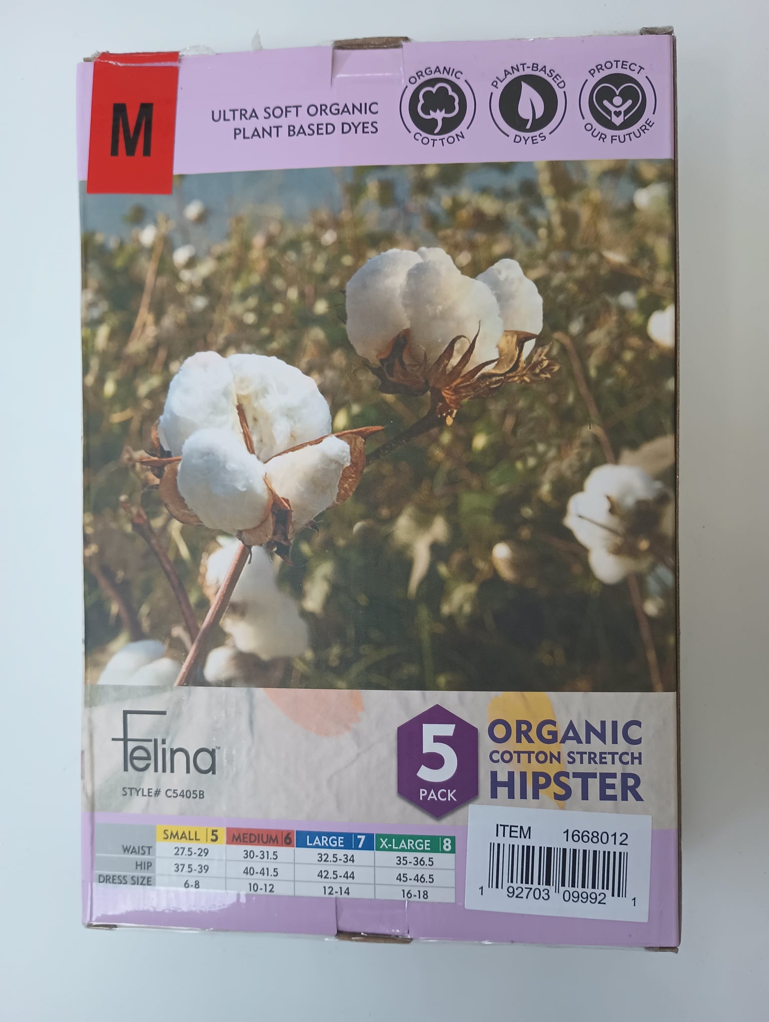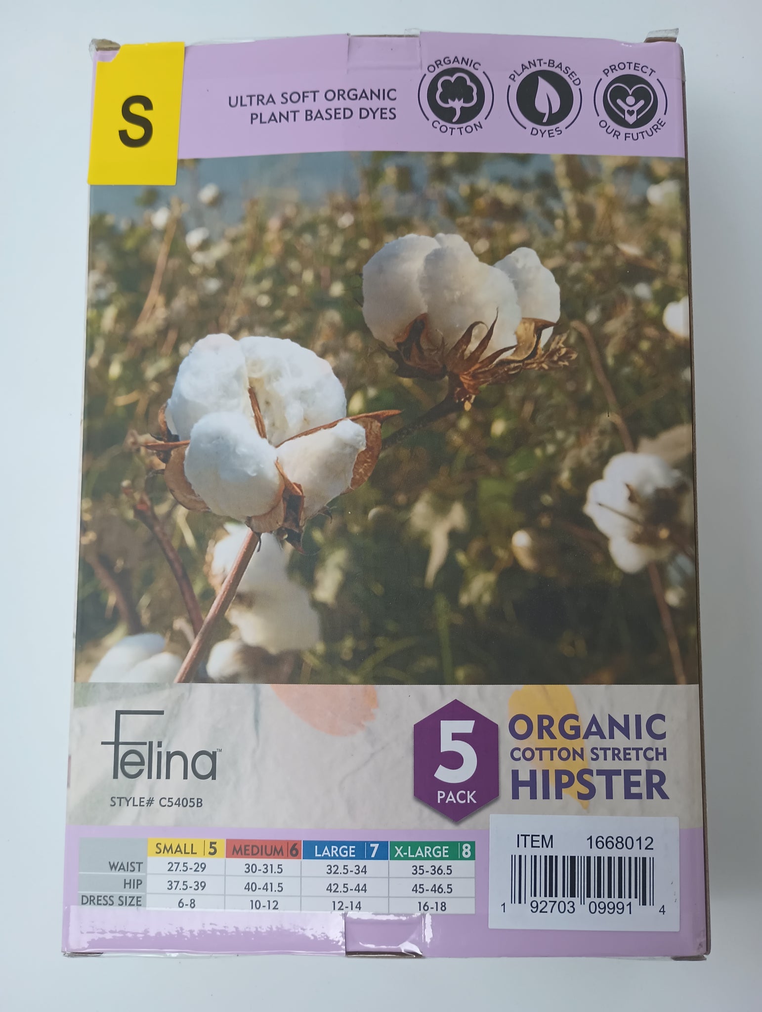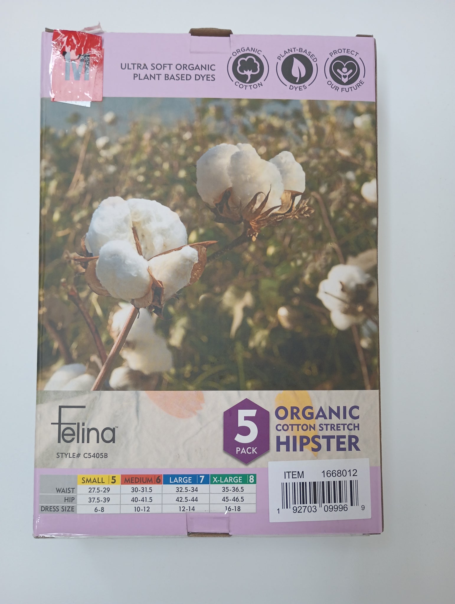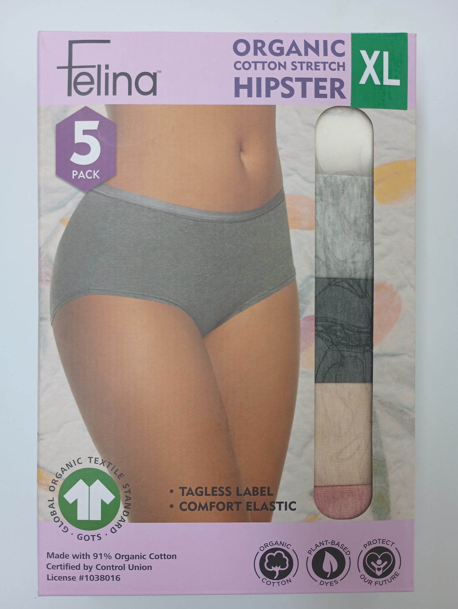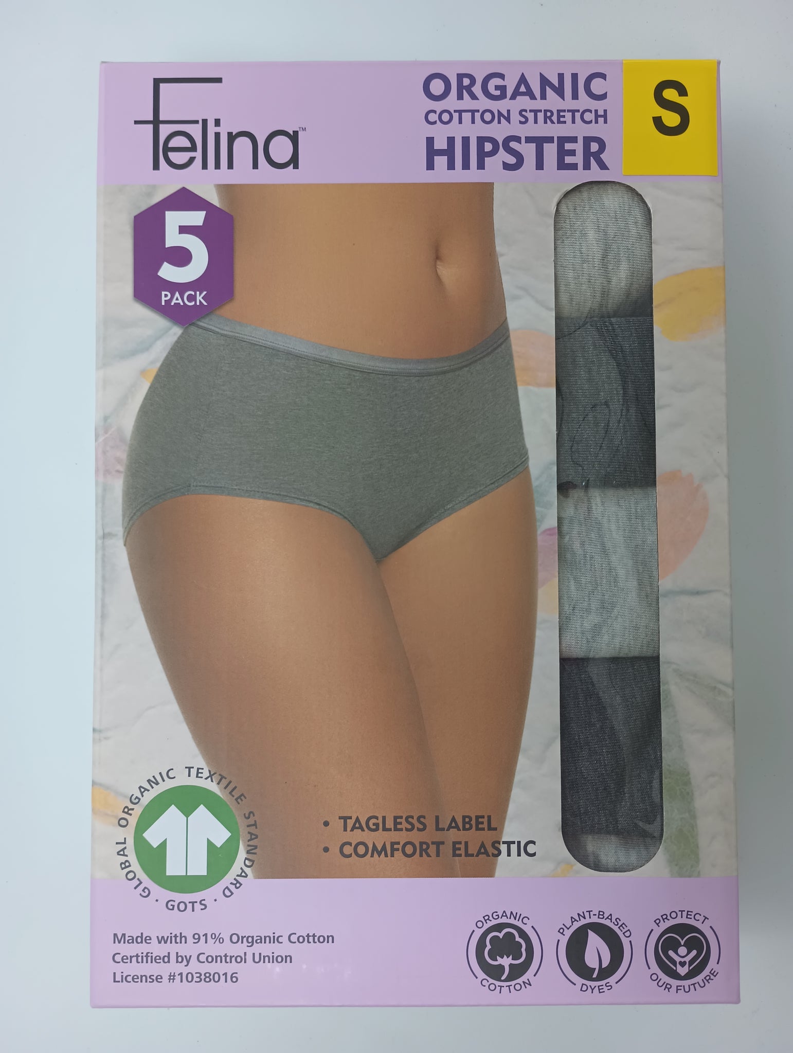 Felina Women's 5 Pack Organic Cotton Stretch Hipster, new.