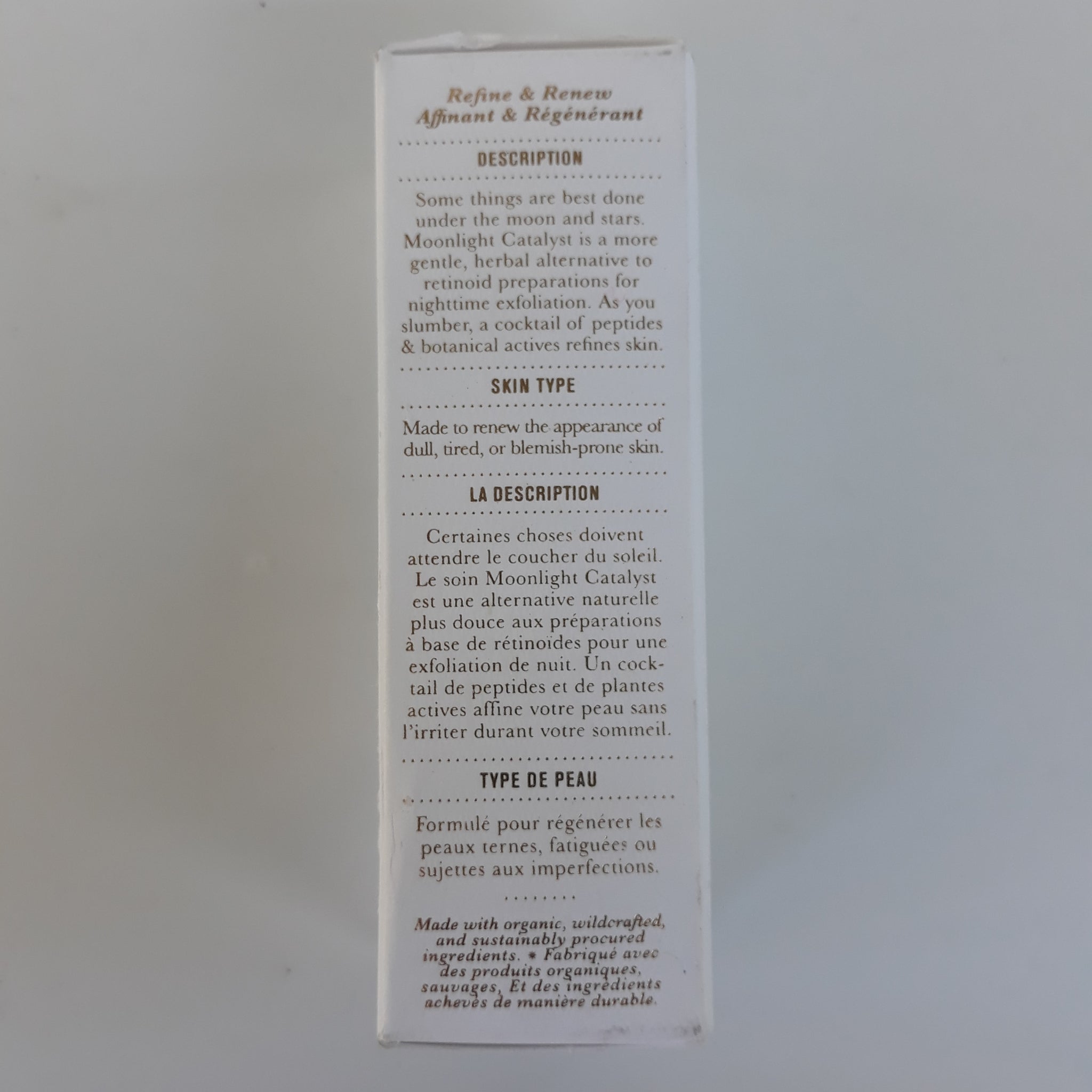 Moonlight Catalyst is a more gentle, herbal alternative to retinoid preparations for nighttime exfoliation. As you slumber, a cocktail of peptides & botanical actives refines skin. Made to renew the appearance of dull, tired, or blemish-prone complexions.