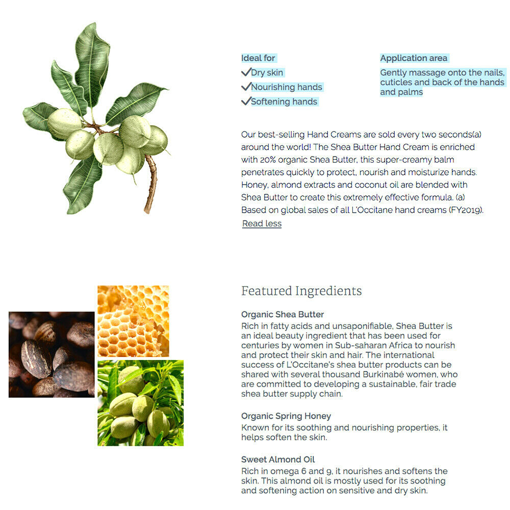 L'Occitane Shea Butter Dry Skin Hand Cream is formulated with 20 percent shea butter, honey, almond extracts and coconut oil to create an extremely effective formula that softens dry skin. Designed to nourish and protect, the rich texture leaves hands soft and smooth, and can be applied as often as needed. Fragrance notes: jasmine and ylang ylang. Formulated with shea butter, honey, almond extracts and coconut oil. Dermatologist testedKeep in cool dry place. Avoid contact with eyes