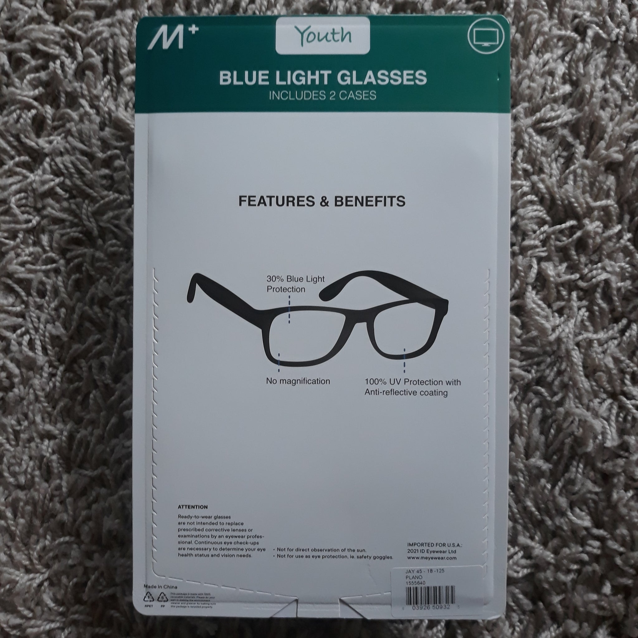 M+ Youth Glasses with Blue Light Protection 2 Pack, new in box. Two protective cases included.