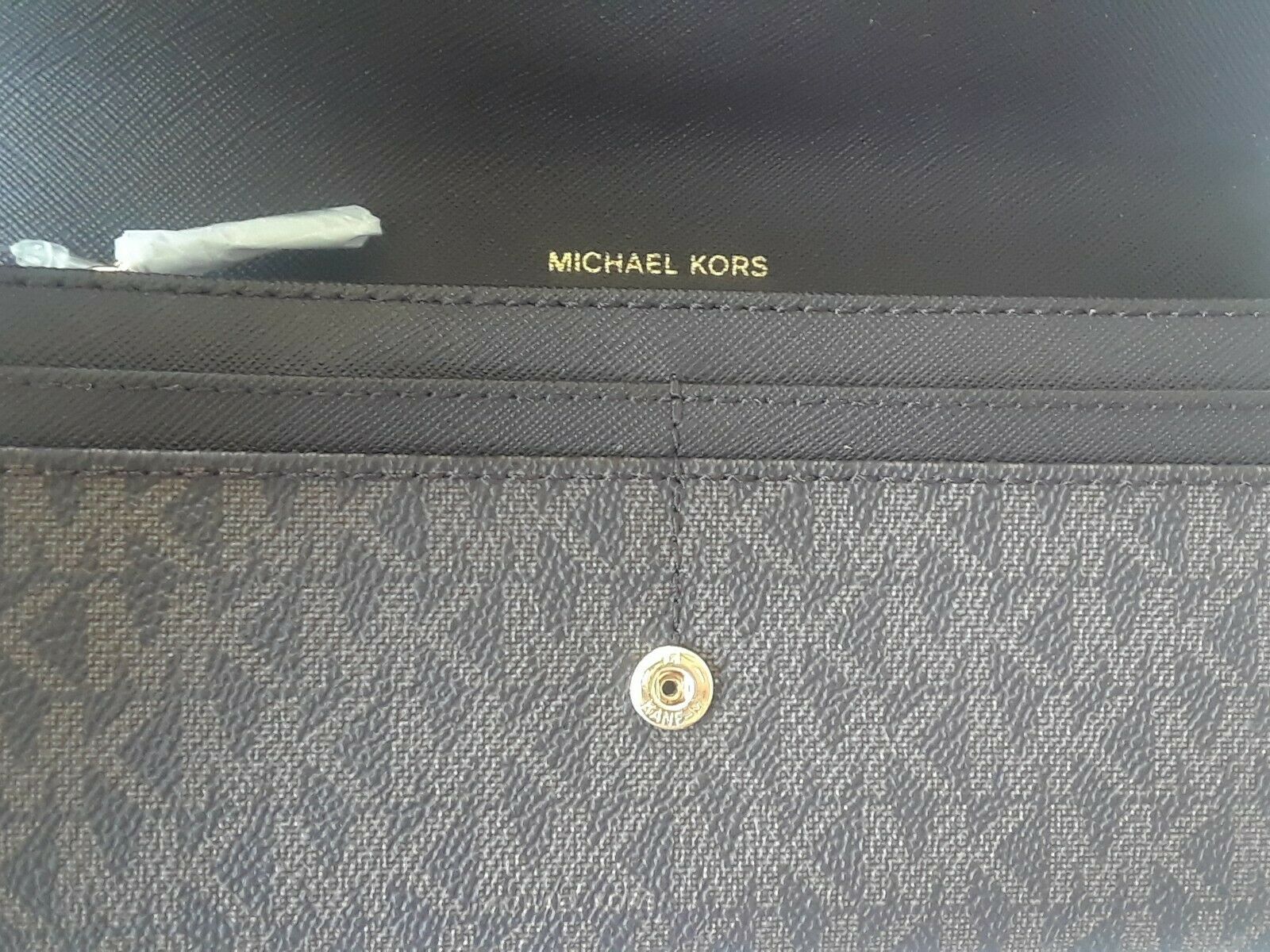 Flap closure. MK Signature PVC Leather. Gold-Tone Hardware. Interior Features 1 Zip Center Pocket - 4 Bill Compartments and 10 Card Slots. Snap Closure. 7.75 Inch (L) x 4 Inch (H) x 1.25 Inch (D).