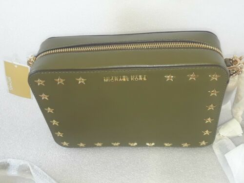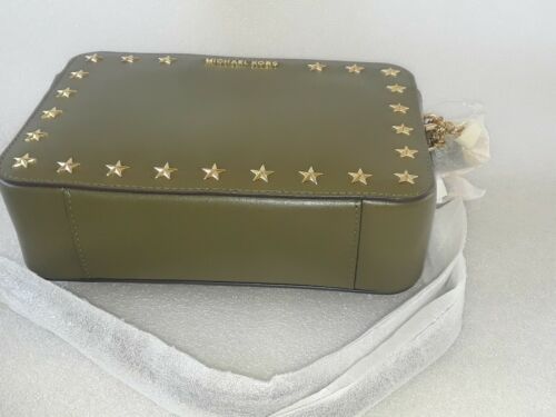 Michael Kors Ginny Medium Camera Olive Leather Stars Studs Crossbody Bag, new with tags.