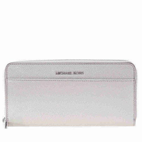 Rich pebble leather takes the shape of a beautifully organized MICHAEL Michael Kors wallet complete with an outside slip pocket for discreetly tucking ticket stubs or receipts. Made of pebbled leather Zip around closure Front slip pocket Interior features zip pocket, currency compartment, two slip pockets, ID window, and 16 card slots Handbag Material: Leather Main Closure Type: Zipper Color: Grey Measurement Guide All measurements are approximate and may vary slightly from the listed information.