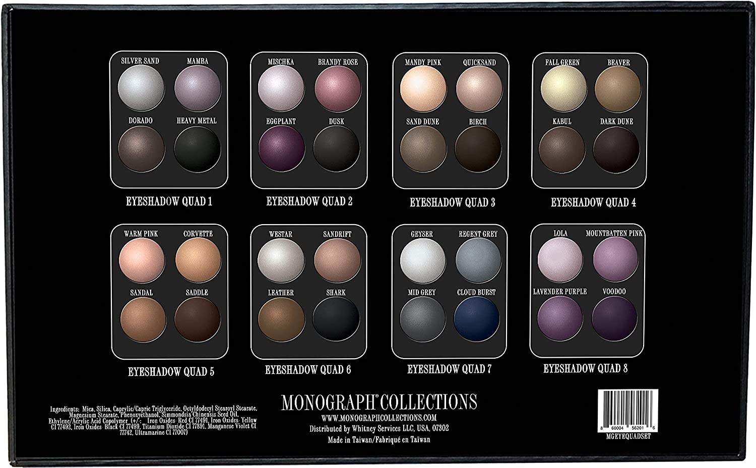 - 8 pressed powder eyeshadow quad compacts [a total of 32 eyeshadows] housed in a beautiful gift presentation box.