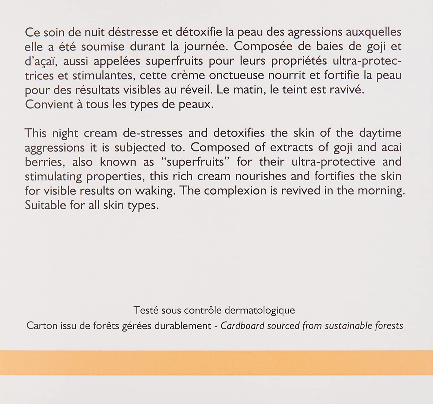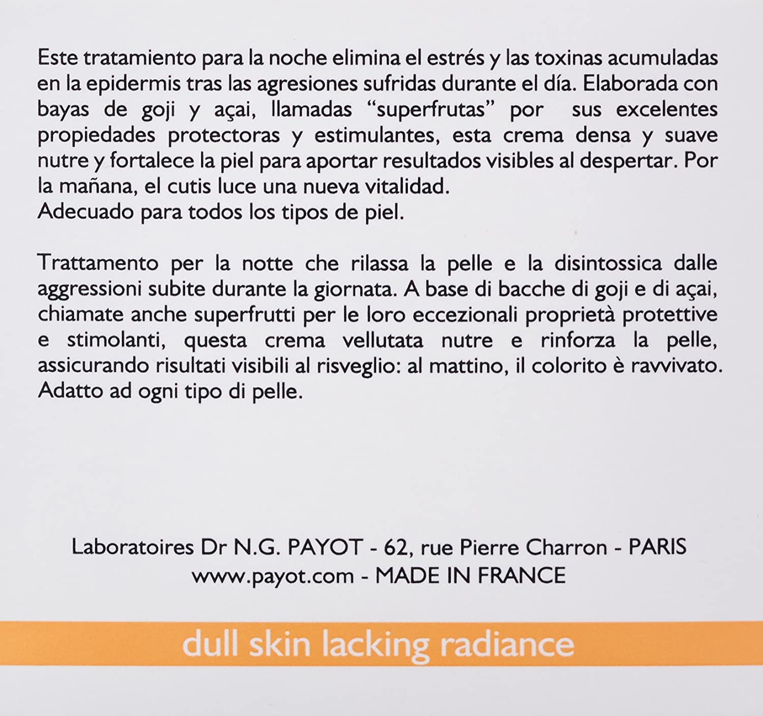 The night cream that wraps skin in a pampering cocoon. My Payot Nuit night cream combines extracts of goji berries, acai berries extracts and hazel extracts to detoxify the skin during the night. In the morning, skin is rejuvenated, strengthened and ready to face a long day. Signs of stress and fatigue disappear.
