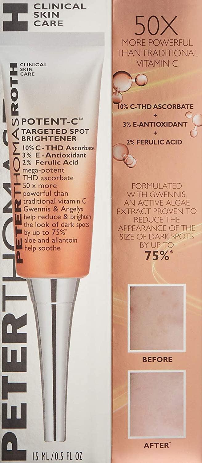 The future of Vitamin C has arrived. Potent-C Targeted Spot Brightener unleashes the strength of powerful antioxidants and THD Ascorbate, an ultra-stable scientific breakthrough ingredient 50 X more powerful than traditional Vitamin C. Packed with a concentration of 10% THD Ascorbate, this potent spot brightener is boosted by 3% Vitamin E and 2% Ferulic Acid, providing powerful antioxidant benefits. Gwennis, an active algae extract, helps reduce the look of dark spot size by up to 75%*. Angelys, an angelica root extract, helps camouflage and reduce the appearance of dark spots, while Aloe and Allantoin help hydrate and comfort the look of skin.