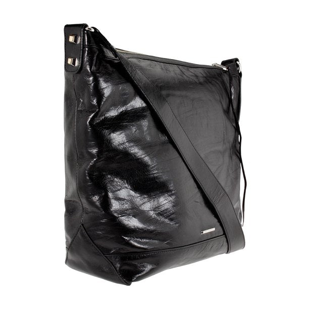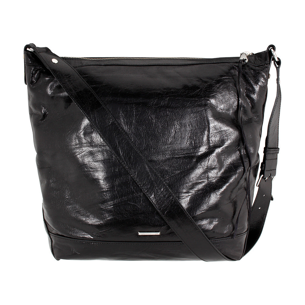 Rebecca Minkoff Regan Ladies Large Leather Hobo Handbag HU17EDSH46. Product Dimensions: 14in (H) x 16in (L) x 8in (W). Features a top zip closure, an exterior zip pocket, and interior slip pockets. Silver tone hardware. Large sized black distressed leather hobo handbag. Regan series.