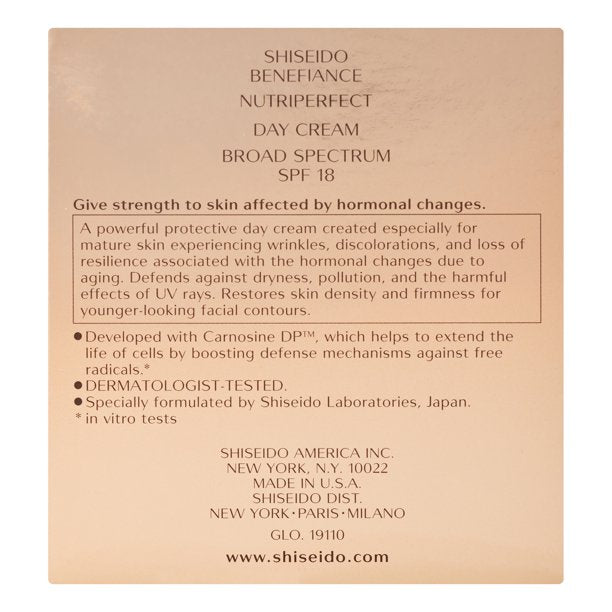 Shiseido Benefiance NutriPerfect Day Cream SPF 18 is a nutrient infused, protective day cream created especially for maturing skin experiencing wrinkles, discoloration, and loss of resilience associated with hormonal changes due to aging.