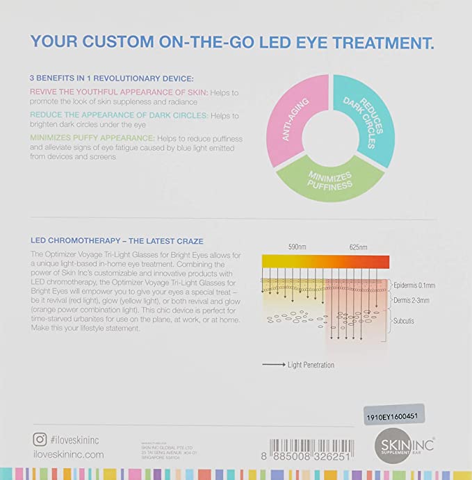 LED CHROMOTHERAPY TECHNOLOGY: Harnessing the power of NASA-inspired LED chromotherapy, the Optimizer Voyage Tri-Light Glasses for Bright Eyes LED light helps addressing your multiple skin concerns. Each light has its unique benefit.