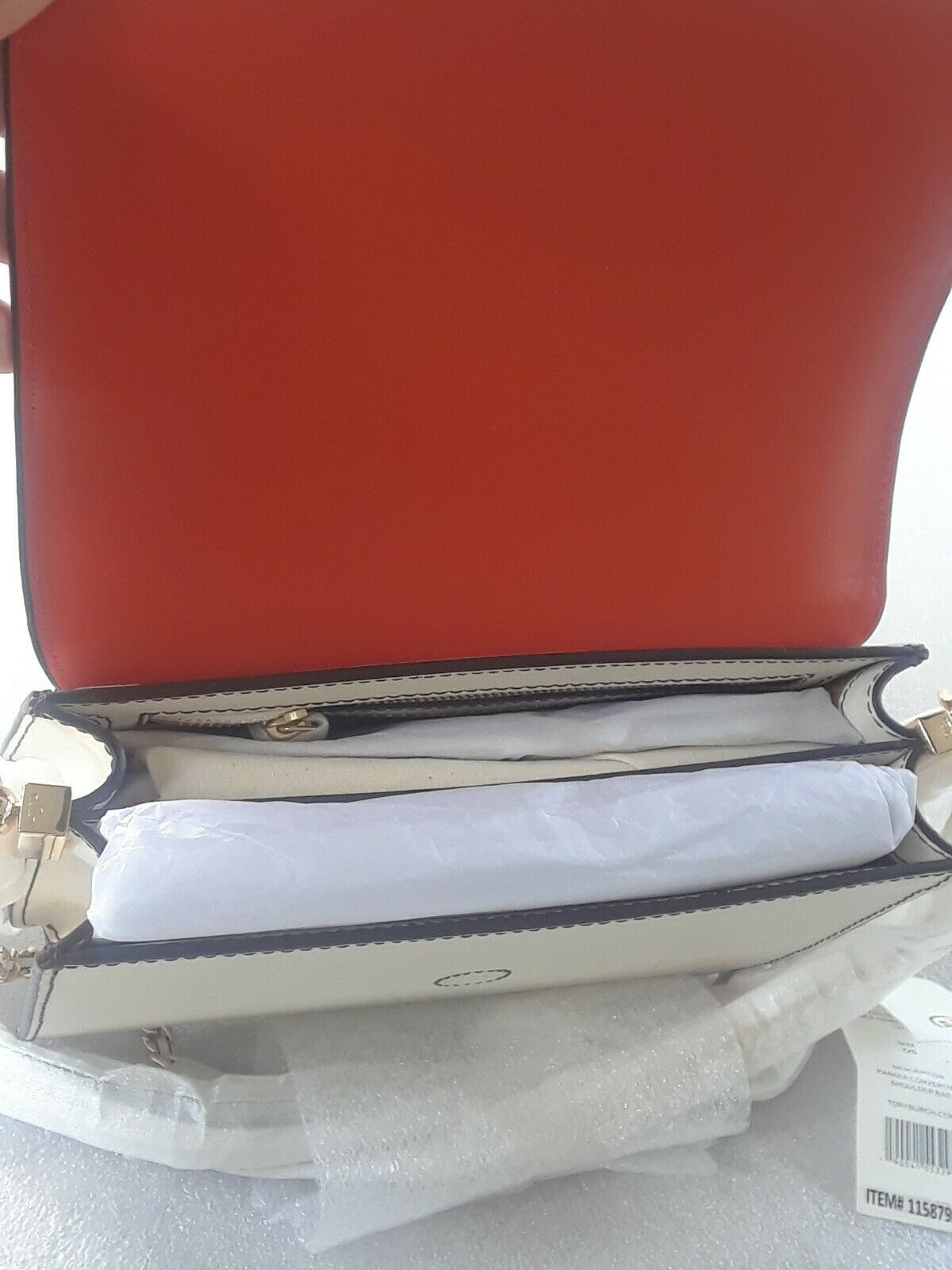A Tory Burch convertible shoulder bag crafted in unlined leather with gold-tone hardware and a fully lined interior. This Tory Burch shoulder bag features a flap with a snap closure, two open pockets and an interior zip pocket; a chain/leather shoulder strap with a 23.31" drop. Dimensions: 6.37" x 8.57" x 3.98".